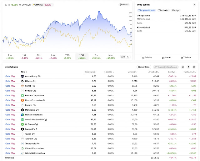 OST-tilin puolella meni sitten paljon paremmin ja tuottoa tuli noin 5 %. Koska hallitus nosti vuonna 2024 OST-tilin maksimirajan 100 000 euron tasolle, niin tämän vuoden teemana oli täyttää se hyvillä osingonmaksajilla. Uusina riveinä tuli Consti, Terveystalo, Talenom, Valmet, ja Fodelia. Lisäsin myös arvo-osuustilin puolella myymääni Mandatumia, Keskoa ja Cityconia. Loppuvuodesta ostin myös Qt Groupia ja Kojamoa.